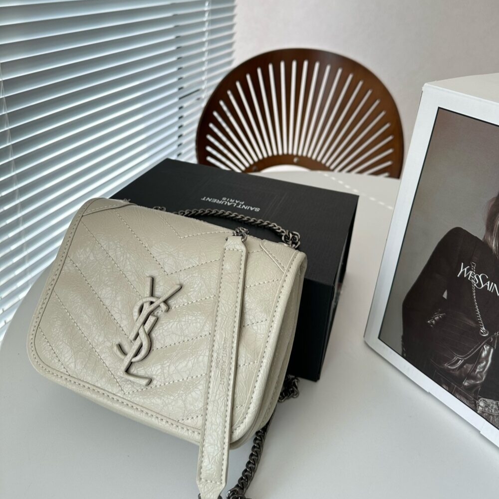 The Bag Saint Laurent Niki Vintage, It features a chevron-quilted design, tonal YSL monogram on the front, and a sliding chain strap with leather shoulder support. Elegant and edgy, it’s perfect for day-to-night wear.