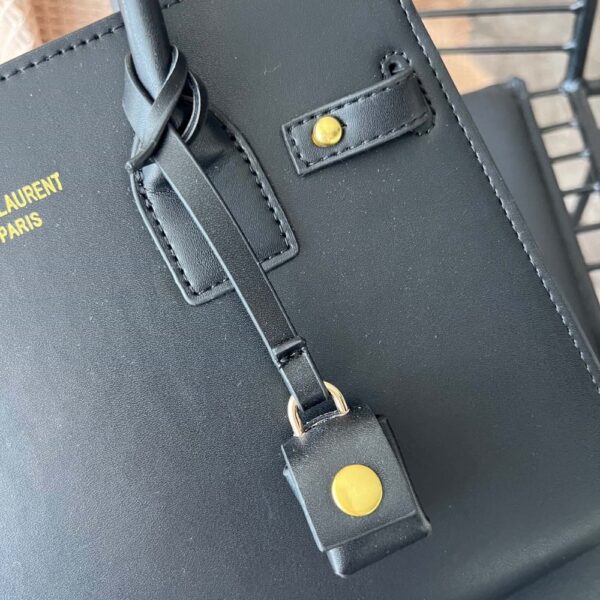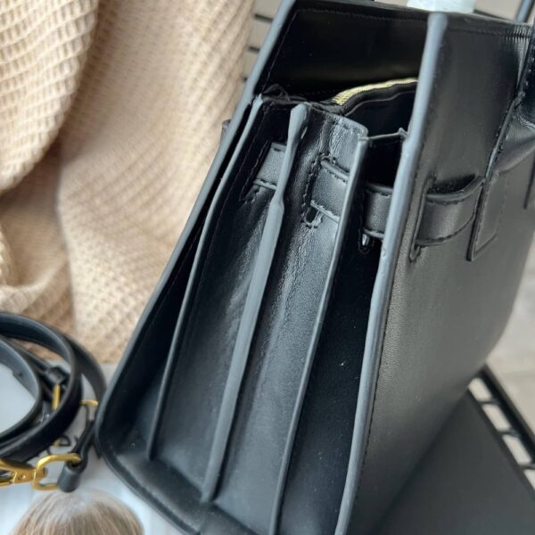 Classic Saint Laurent Sac de jour Nano shoulder bag in black, hardware in light bronze metal, double handle in black leather, black leather removable strap to be worn accross the body allowing the bag to be worn in the hand or on the shoulder or accross the body.