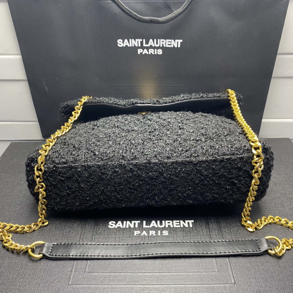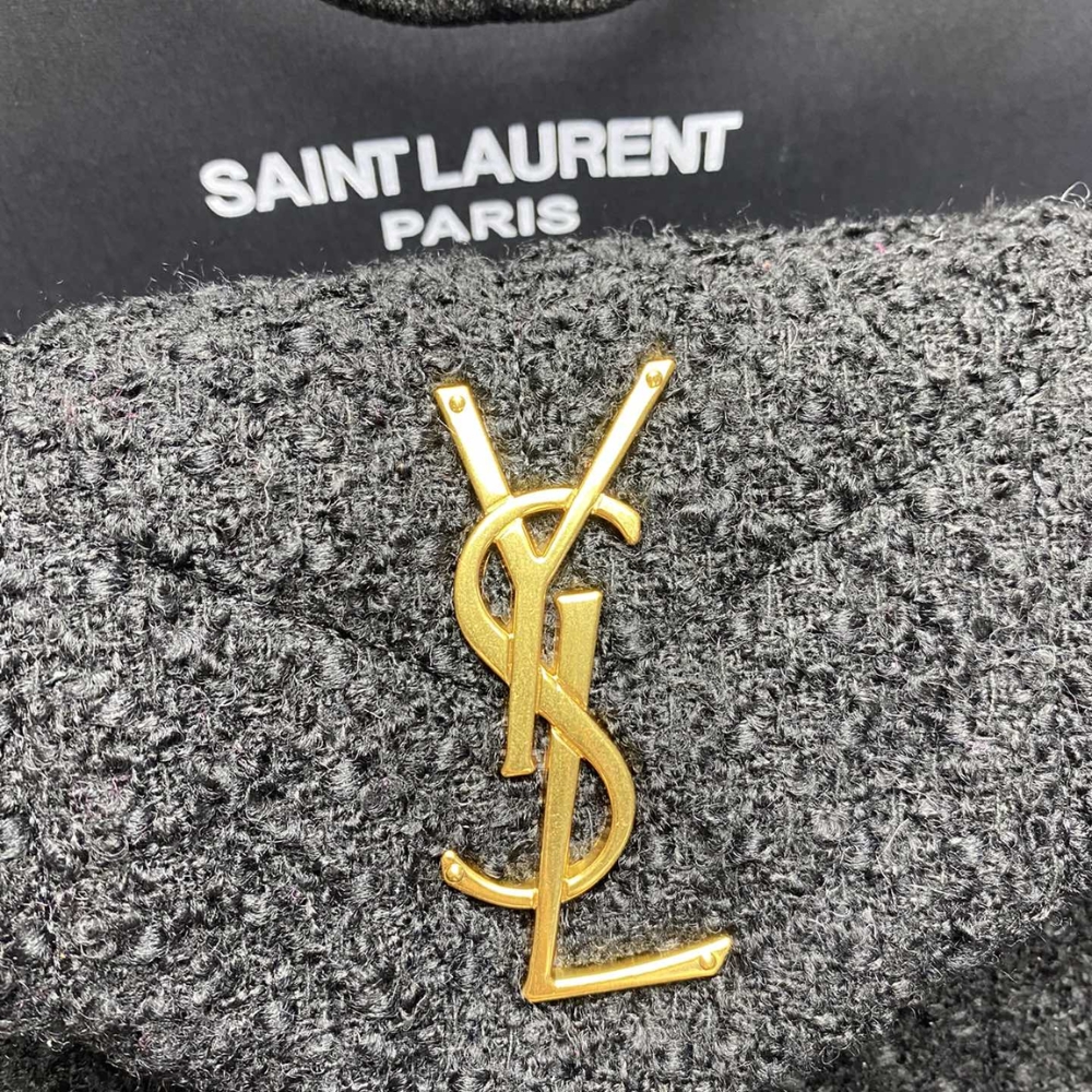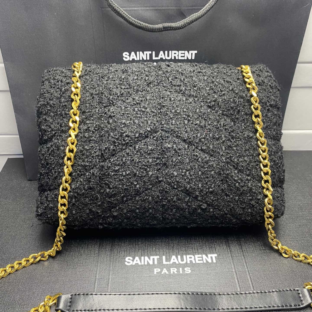 The Saint Laurent Bag in luxe black, accented with a bold gold YSL logo. Its soft, slouchy silhouette adds effortless Parisian chic to any outfit. Finished with a gleaming gold chain strap, it’s the perfect mix of elegance and edge.