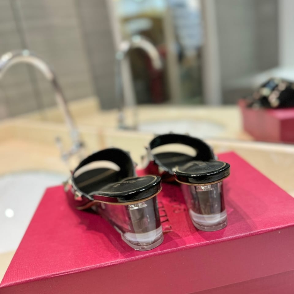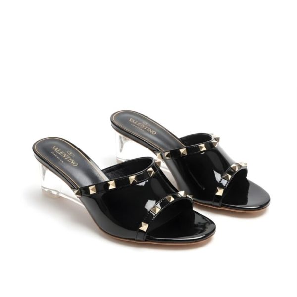 The Valentino Garavani Rockstud Skin Heeled Sandals in black are a bold fusion of contemporary edge and high-fashion luxury. These sandals feature slender straps embellished with the Maison’s signature gold-finish pyramid studs, set against polished patent leather. The avant-garde design is defined by a striking clear plexiglass wedge heel, creating a sophisticated β€œfloating” effect. With their open-toe silhouette and minimalist construction, these heels serve as a glamorous statement piece for both modern evening wear and elevated daytime looks.