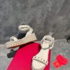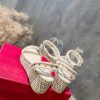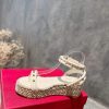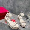Description 1:1 Replica Shoes Platinum-finish studs Adjustable ankle strap Wedge wrapped in silk torchon and metallic thread